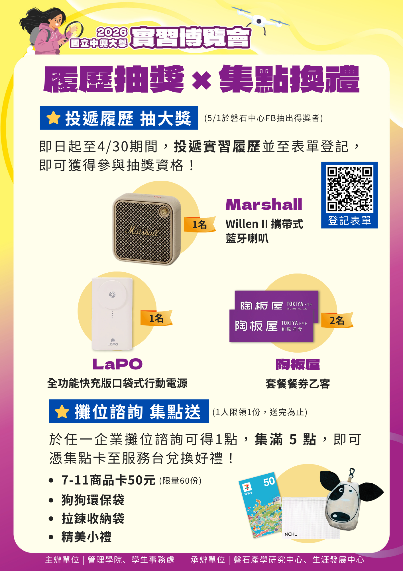 2026實習博覽會 將於4/23(四) 登場!今年匯聚 20 家 優質企業,提供 300+ 實習職缺,為同學帶來多元實習機會!特舉辦拿好禮抽大獎活動,活動詳情如下: